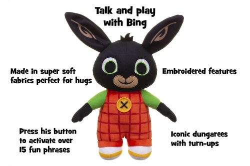 Plyšový hovoriaci BING populárnej rozprávky králiček Bing. Je to skvelý spoločník, vie viac ako 15 fráz. Keď stlačíš gombík/bruško počuješ ako Bing hovorí. Je vyrobený z mäkučkého mazlivého vysoko kvalitného materiálu. Súčasťou balenia sú 3AA batérie, ktoré sa dajú vymeniť.