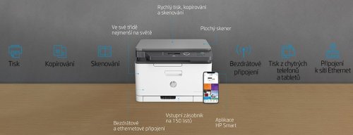 Obsah balenia: HP Color Laser MFP 178nw; Predinštalovaná zavádzacia čierna tlačová kazeta pre laserové tlačiarne HP (700 strán); Azúrová tlačová kazeta pre laserové tlačiarne HP (500 strán); Žltá tlačová kazeta pre laserové tlačiarne HP (500 strán); Purpurová tlačová kazeta pre laserové tlačiarne HP (500 strán);