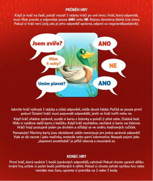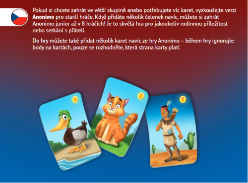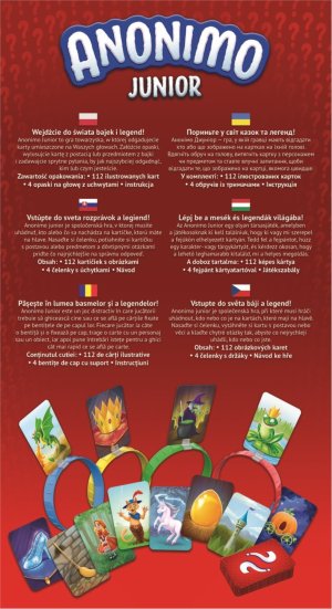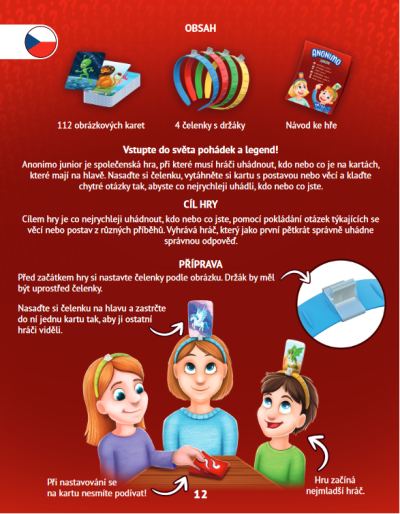 Vstúpte do sveta bájí a legiend! Anonimo junior je spoločenská hra, pri ktorej musia hráči uhádnuť, kto alebo čo je na kartách, ktoré majú na hlave. Nasaďte si čelenku, vytiahnite si kartu s postavou alebo vecou a klaďte múdre otázky tak, aby ste čo najrýchlejšie uhádli, kto alebo čo ste. Hra obsahuje: 112 obrázkových kariet, 4 čelenky s držiakmi, návod. Rozmer krabice: 14,5 x 26 x 10 cm Vhodné pre deti od 4 rokov
