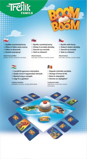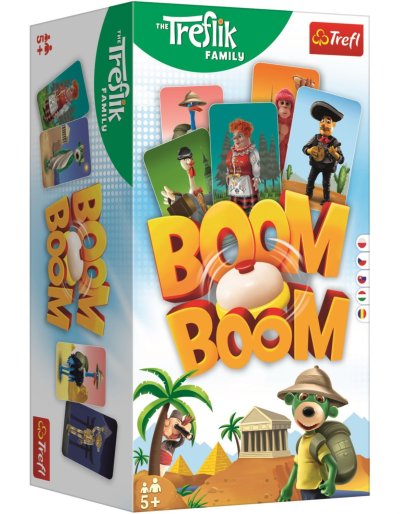TREFL Boom Boom je dynamická rodinná hra, v ktorej hrajú hlavnú rolu postreh a dobré reflexy. V Boom Boom sa hráči snažia zbierať sady rovnakých postáv s postavičkami zo seriálu Treflíci. Všetci hráči si vymieňajú svoje karty súčasne s kartami na hracej ploche. Po získaní štvorice kariet hráč zazvoní na zvonček, aby signalizoval, že splnil úlohu. Znie to jednoducho, ale karty na stole sa neustále obmieňajú, pretože všetci hráči hrajú súčasne a berú karty svojich protivníkov. Prvý hráč, ktorý nazbiera správny počet sád, je víťaz! Obsah balenia: 56 kariet, zvonček, hrací plán, návod v češtine, slovenčine. Vhodné pre hráčov od 6 rokov.