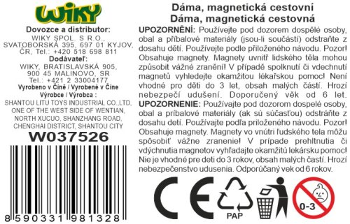 Hra dáma magnetická cestovná. Rozmery puzdra 10x18,5 cm. Plechové puzdro slúži po otvorení ako hracia doska. Figúrky sú magnetické.