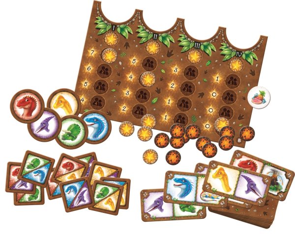 obojstranná hracia doska 60 kariet s dinosaurami 3 základné karty 5 základných žetónov s dinosaurami 10 žetónov s dinosaurami pre zložitejší variant 18 žetónov s lávou 1 žetón s maškrtou návod k hre