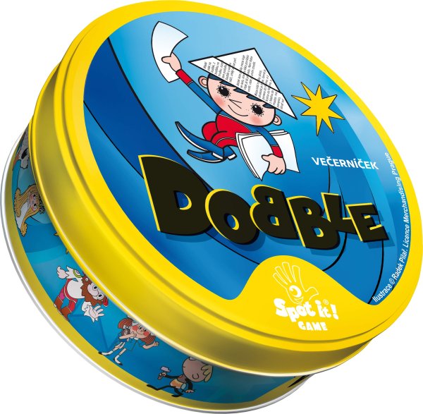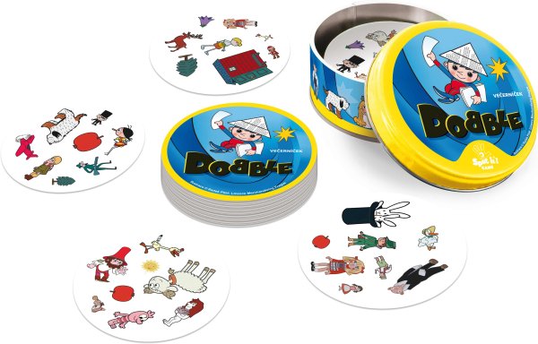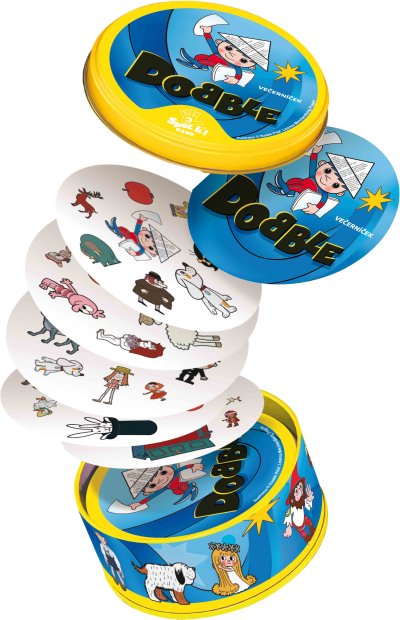 Neexistuje snáď nikto, kto by nemal rád obľúbený detský program Večerníček. Už vyše pol storočia baví malých aj veľkých divákov u nás aj na Slovensku. Pripomeňte si spoločne s celou vašou rodinou obľúbené postavičky z rozprávok a užite si tú najlepšiu postrehovú zábavu. Bob a Bobek, lúpežník Rumcajs, Ája a maxipes Fík, Edudant a Francimor a mnoho ďalších obľúbených postáv z Večerníčkov, ako ich poznáte. Rýchlosť, postreh, reflexy! Buďte prvý, kto nájde zhodný symbol na dvoch kartách! Dobble, to je 57 rôznych symbolov, 55 kariet, 8 symbolov na karte a každé dve karty spolu majú spoločný iba jeden! Hra ponúka úplne unikátnu zábavu. Hráči tu hľadajú dva rovnaké symboly na kartách pri rôznych verziách hry v pravidlách je popísané celkom 5 hier. Super sú okrúhle karty aj jednoduché pravidlá, vysvetlené doslova za pár sekúnd. Obsah balenia je 55 kariet v plechovej krabičke a 1 české a slovenské pravidlá.