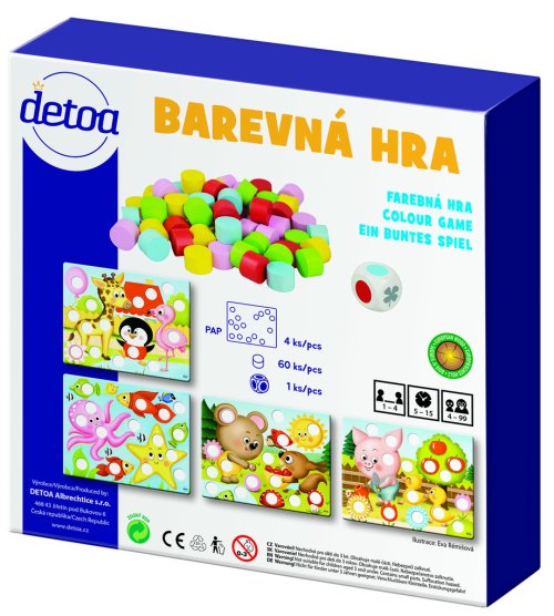 Dosková hra pre najmenších hráčov od 4 rokov a ich rodičov. Hra pomôže vyplniť deťom a ich rodičom spoločne strávené chvíle. Rozvíja znalosť základných farieb a motoriku rúk. Výrobok spĺňa požiadavky EÚ na bezpečnosť hračiek a je vhodný pre deti od 4 rokov. Balené v papierovej krabici s rozmermi 200x200x37 mm. Obsah balenia je 60 farebných drevených valčekov, hracia kocka, 4 herné dosky z tvrdého kartónu.
