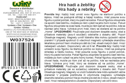 Hra hady a rebríky magnetická cestovná. Rozmery puzdra 10x18,5 cm. Plechové puzdro slúži po otvorení ako hracia doska. Figúrky sú magnetické. Súčasťou hracia kocka.