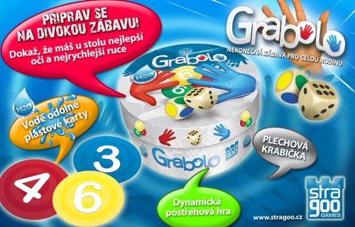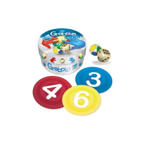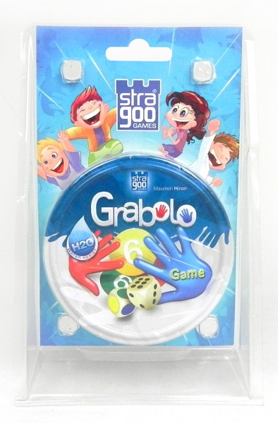 GRABOLO je rýchla kontaktná postrehová hra. Dokáž, že máš pri stole najlepšie oči a najrýchlejšie ruky. Kocky určia kombináciu farby a čísla a ty musíš rýchlo reagovať. Cieľom hry je získať predpísaný počet kariet. Plechová krabička obsahuje 36 plastových vodeodolných kariet, 1 farebnú kocku a 1 kocku s číslami Hra je určená pre 3 - 5 hráčov, trvá 8 - 10 minút, odporúčaný vek 6 - 99 rokov.
