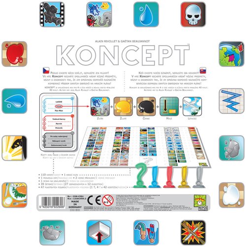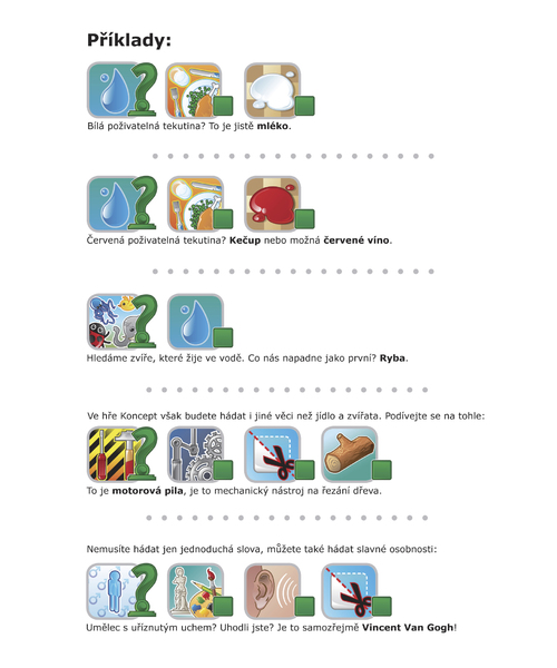 Karty Konceptu obsahujú slová a frázy troch stupňov obtiažnosti - ľahké, ťažké a výzva. Pre prvé hry odporúčame používať iba jednoduché slová. Frázy z obtiažnosti výzva už vyžadujú od všetkých hráčov skutočne dokonalé zvládnutie hry. Tím si vytiahne hornú kartu konceptu a vyberie si slovo alebo frázu zo zoznamu na karte, ktorú budú ostatní hráči hádať. Ako prvé umiestnite na hrací plán figúrku hlavného konceptu (otáznik) a potom ďalšie kocky rovnakej farby pre naznačenie celého hlavného konceptu. Ak chcete, môžete umiestniť ďalšie figúrky a kocky rovnakej farby (pozri príklady) a upresniť tak hlavný koncept.