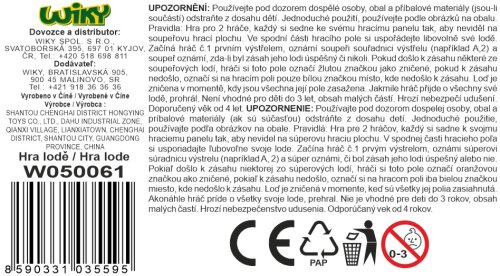 Hra lode. Hra pre 2 hráčov. Veľkosť 15 cm. Obsah balenia - dve hracie dosky, 10 lodí, množstvo farebných a bielych tyčiniek, ktorými hráči značia zásah, alebo minútou. Obsahuje návod s popisom hry.