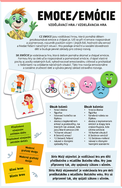 Malý objaviteľ – Emócia je vzdelávacou hrou, pri ktorej sa deti učia emócie rozpoznávať a pomenovať, rozumieť pocitom svojim aj iných ľudí, hodnotiť silu emócií a hľadať riešenie náročných situácií. Hra posilňuje emocionálne a sociálne zručnosti detí a buduje pevné základy pre zdravý rozvoj.