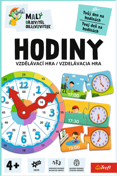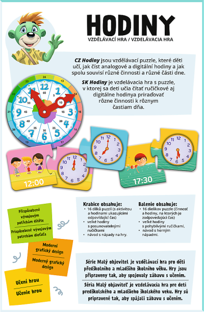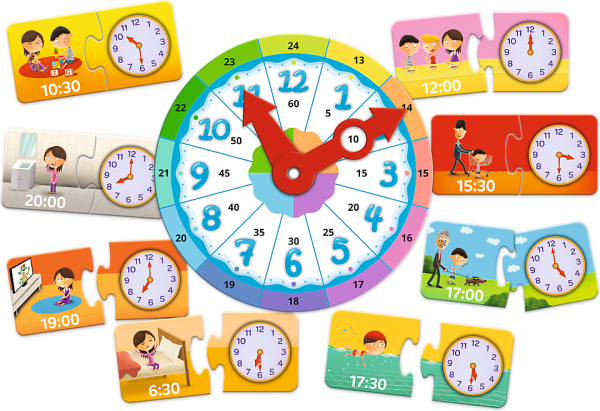 Vzdelávacie skladačka, ktorá pomáha spoznať fungovanie hodín a učia priradiť rôzne činnosti príslušným častiam dňa. Rozvíja schopnosť plánovania, základné matematické schopnostou