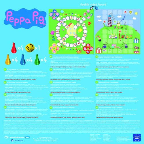 Klasická stolová hra pre celú rodinu s motívom animovaného detského seriálu Prasiatko Peppa. Postav figúrky do štartovacieho domčeka. Počkaj až hodíš na kocke šestku a môžeš vyraziť. Tvojou úlohou je dostať všetky tvoje figúrky až do cieľového domčeka. Daj pozor, aby ťa cestou súperovi nevyhodili späť na štart! Balenie obsahuje: