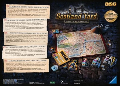 Scotland Yard potrebuje vašu pomoc! Profesor Moriarty je na úteku. Naposledy bol videný, ako uteká teplovzdušným balónom nad Temžou! Použite svoje dedukčné schopnosti, aby ste ho dopadli, ale buďte opatrní... Moriarty je nebezpečný a spriada plány na ďalšie zločiny. Nájdite ho, než bude neskoro! V tejto verzii hry Scotland Yard pátra Sherlock Holmes a jeho spoločníci po zločineckom géniovi, profesorovi Moriartym. Môžete si vybrať, či budete hrať detektívov, alebo Moriartyho. Hru môžete hrať podľa pôvodných pravidiel alebo podľa špeciálnych pravidiel Sherlocka Holmesa. "Ach, to ste vy... poďte ďalej! Pán Holmes a ostatní vás už očakávajú. Spoločnými silami určite uspejete a konečne dopadnete profesora Moriartyho!" Dvere bytu na Baker Street 221B sa zatvárajú - hon na Moriartyho začína! Obsahuje: 1 herný plán, 29 štartových kariet, 134 lístkov, 6 hracích figúrok, 10 žetónov postáv, 6 hráčskych tabuliek, 1 cestovnú tabuľku s papierom a ceruzkou, 1 kartónový prúžok, 1 šilt, 3 krúžky (strážnici), 15 kariet z miesta .