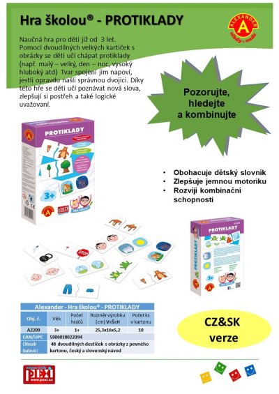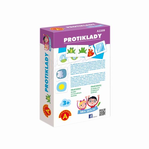 Deti sa učia protiklady, tvar spojenia im napovie, či naozaj našli správnu dvojicu. Náučné hranie pre malých objaviteľov na objavovanie protikladov - od 3 rokov do 6 rokov. Tvar spojenia dielikov deťom napovie, či naozaj našli správnu dvojicu. Pomocou dvojdielnych veľkých kartičiek s obrázkami sa deti učia chápať protiklady (napr. malý – veľký, deň – noc, vysoký – hlboký atď). Skvelá mnemotechnická pomôcka. Rozmery balenia 16 x 25 x 5 cm. Vhodné pre deti od 3 rokov.