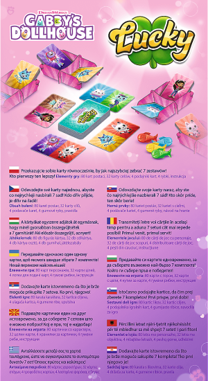 Odovzdajte svoje karty naraz, aby ste čo najrýchlejšie nazbierali 7 sád! Kto skôr príde, je skôr na rade! Balenie obsahuje: 80 kariet postáv, 32 kariet cieľov, 4 podávače kariet, 4 gumové ryby, pravidlá. Rozmer krabice: 14,5 x 26 x 10 cm Vhodné od 5 rokov