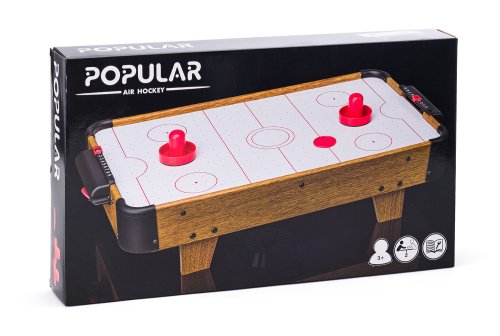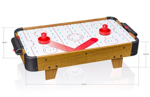 Preverí postreh a obratnosť hráčov. Vďaka vzduchu vháňanému zospodu vstavaným ventilátorom môže puk hladko, ale hlavne bleskurýchlo kĺzať po hracej ploche. Hráči majú k dispozícii špeciálne pálky, ktorými sa snažia streliť puk do súperovej bránky. Rakety sú v spodku opatrené plsťou pre ľahký a bezhlučný pohyb. Rýchla akčná hra pre 2 hráčov. Batérie: 3 x AA (nie sú súčasťou). | Vek. 3+ | Rozmer: 57 x 30 x 12,5 cm
