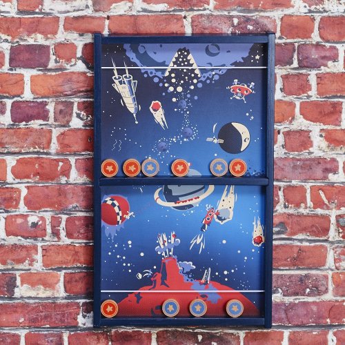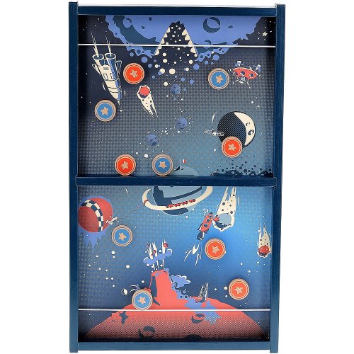 3, 2, 1… a letíme nahor! Cestujte vesmírom v tejto veľkolepej shuffleboardovej hre s retro vzhľadom. Cieľom je zbaviť sa všetkých svojich pukov skôr ako súper na svojej strane hernej plochy alebo upratať všetky puky zo svojej hracej plochy k súperovi. Musíte použiť gumičku upevnenú na bokoch ako vystreľovač a byť najšikovnejší, aby ste zamierili na jedinú dieru v strede hry a puk tu preletel. Pre najlepších strelcov môže stred nahradiť iná prekážka s 2 mimostredovými otvormi! Hlavné vlastnosti: zábavná postrehová hra rozvíja motoriku detí stredové otvory sú vymeniteľné pre jednoduchšie a zložitejšie hruoriginálny retro vzhľad