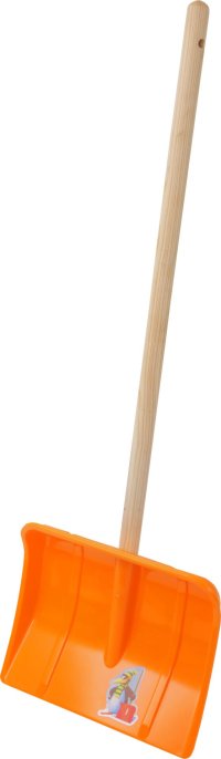 Detské hrablo na sneh s oranžovou pracovnou časťou a drevenou násadou.