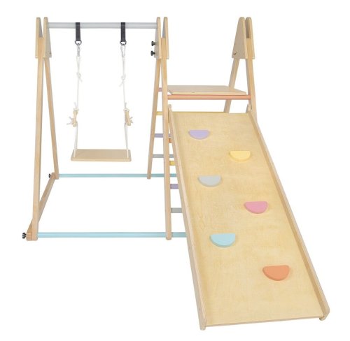 Drevená hracia zostava je určená na vnútorné použitie a ponúka nielen praktický, vkusný dizajn, ale aj funkčné využitie. Vzhľadom k dizajnu a zvolenej farebnosti - prírodného dreva kombinovaného s tlmenými, pastelovými odtieňmi - sa stáva skvelým doplnkom do každej izbičky! Multifunkčnosť tejto hracej zostavy ponúka širokú škálu aktivít ako preliezanie, hojdanie, kĺzanie alebo lezenie. Vďaka týmto činnostiam deti rozvíja motorické zručnosti, rovnováhu či koordináciu pohybu. Výrobok je tvorený z hojdačky, rebriny a dosky s pastelovými úchytmi. Doska je možné nastaviť na výšku zavesením na priečku rebriny, je obojstranná, z jednej strany slúži ako šmykľavka az druhej ako lezecká dráha. Vyžaduje sa montáž dospelej osoby. Dodáva sa s detailným návodom na zostavenie (CZ, SK, EN). Hlavné vlastnosti: na vnútorné použitiemultifunkčné vlastnosti nosnosť max. 40 kgoboustranná doska s úchytmitrénuje motoriku a rovnováhuskvelý doplnok do herného kútikaprodukt možno využiť na pohybovú terapiu