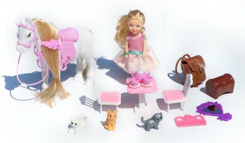 Hrací set obsahuje bábiku, koníka, mačky, stolček, stoličky, truhlu a ďalšie doplnky.
