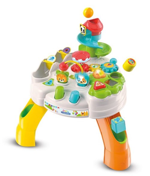 Veselý hrací stolík Clemmy baby s kockami a zvieratkami zabaví vaše deti po dlhý čas. Hrací stolček s mnohými aktivitami, ktorých cieľom je stimulovať interakciu s dieťaťom . Vkladacie tvary so svetlami a zvukmi, otáčajúce sa ozubené kolieska a tlačidlá ovládajúce psíka a mačku. Súčasťou stolíka je zábavná trasa pre loptičky s množstvom úžasných šmykľaviek a prekážok. Loptičky končí svoju jazdu v nohe stolíka. Hračka stimuluje manuálne zručnosti, vizuálne vnímanie a rozpoznávanie vzťahu medzi príčinou a následkom.