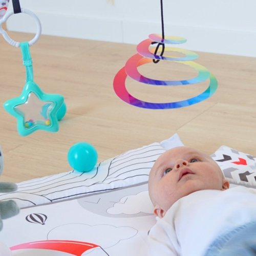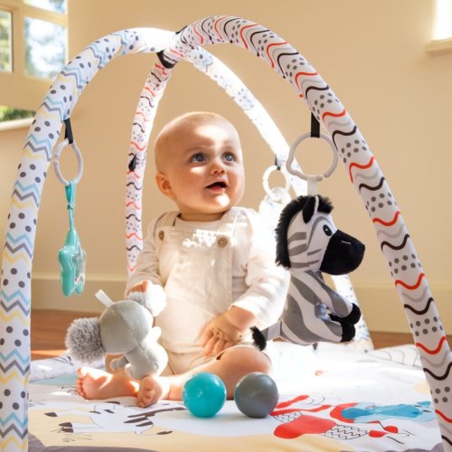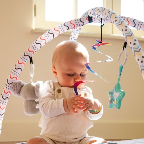 • na hrazdičke je zavesených 5 hračiek s rôznymi aktivitami - je možné ich zložiť a zameniť za iné