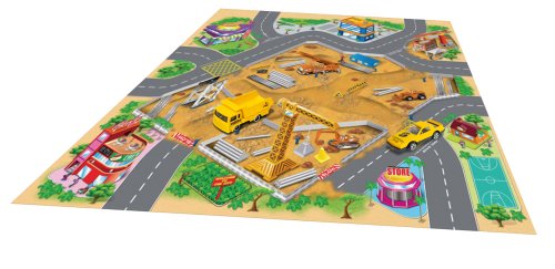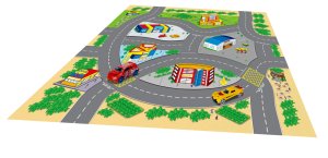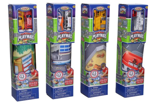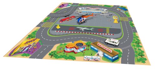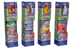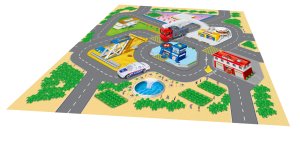 Hracia mapa s 2 dopravnými prostriedkami. Rozmery hracej mapy 70x70 cm, dopravných prostriedkov 6-8 cm. Súčasťou textilná hracia mapa, 2 kovové dopravné prostriedky. 4 varianty - záchranné zložky, letisko, stavebné, závodné.