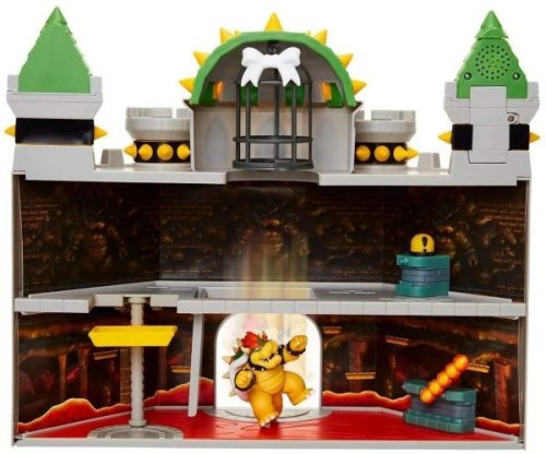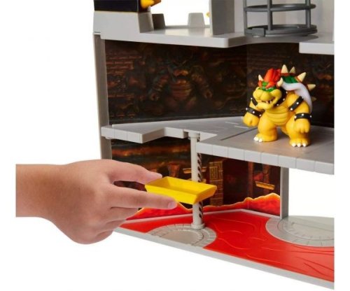 Hracia sada Deluxe Super Mario a Bowser's hrad so zvukom vám umožnia preskúmať túto klasickú úroveň z videohier Super Mario. Súčasťou tejto hernej sady sú exkluzívne 9 cm figúrky Bowsera v interaktívnom prostredí s funkčnými mechanizmami a autentickými zvukmi v hre Môžete posunúť výťah hore a dole roztočte ohnivé gule otvorte dno klietky a porazte Bowsera spustením padacích dverí, aby ste ho zhodili do lávy pod lávou.