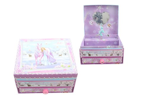 Hracia skrinka šperkovnica truhla. Vnútri špekovnice je zrkadlo a jednorožec, ktorý po natiahnutí kľúča tancuje a hrá. Veľkosť cca 16 x 14 x 9 cm. Balené v igelitovom sáčku. Šperkovnica má dole šuplíček. Výrobok nie je hračka.