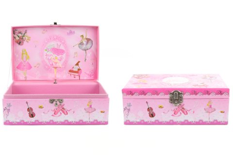 Hracia skrinka šperkovnica baletka. Vnútri špekovnice je zrkadlo a baletka, ktorá po natiahnutí kľúča tancuje a hrá. Veľkosť cca 22,5 x 14,5 x 8,5 cm. Balené v igelitovom sáčku. Vek 3+