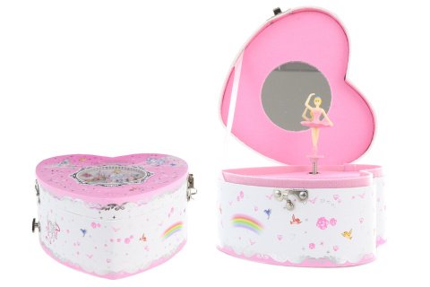 Hracia skrinka šperkovnice srdiečko. Vnútri špekovnice je zrkadlo a baletka, ktorá po natiahnutí kľúča tancuje a hrá. Veľkosť cca 16,5 x 15 x 8 cm. Balené v igelitovom sáčku. Výrobok nie je hračka.