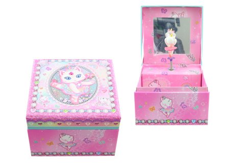Hracia skrinka šperkovnica truhla. Vnútri špekovnice je zrkadlo a mačka, ktorá po natiahnutí kľúča tancuje a hrá. Veľkosť cca 11 x 11 x 8 cm. Balené v igelitovom sáčku. Výrobok nie je hračka.
