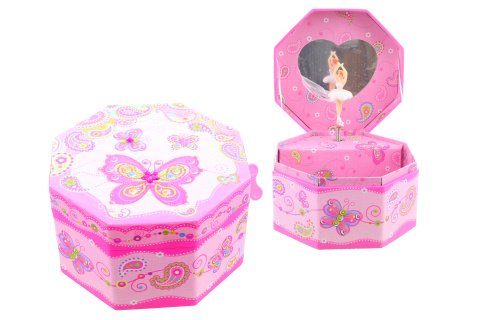 Hracia skrinka šperkovnica truhla. Vnútri špekovnice je zrkadlo a baletka, ktorá po natiahnutí kľúča tancuje a hrá. Veľkosť cca 13 x 13 x 7 cm. Balené v igelitovom sáčku. Výrobok nie je hračka.