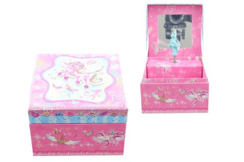 Hracia skrinka šperkovnica truhla. Vnútri špekovnice je zrkadlo a jednorožec, ktorý po natiahnutí kľúča tancuje a hrá. Veľkosť cca 11 x 11 x 8 cm. Balené v igelitovom sáčku. Výrobok nie je hračka.
