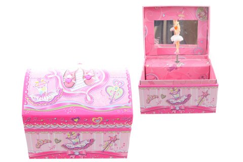 Hracia skrinka šperkovnica truhla. Vnútri špekovnice je zrkadlo a baletka, ktorá po natiahnutí kľúča tancuje a hrá. Veľkosť cca 13 x 10 x 10 cm. Balené v igelitovom sáčku. Výrobok nie je hračka.