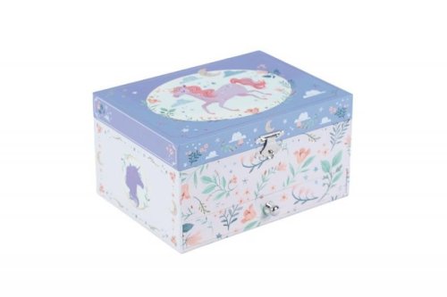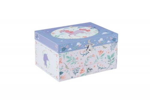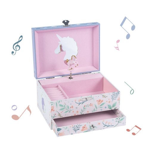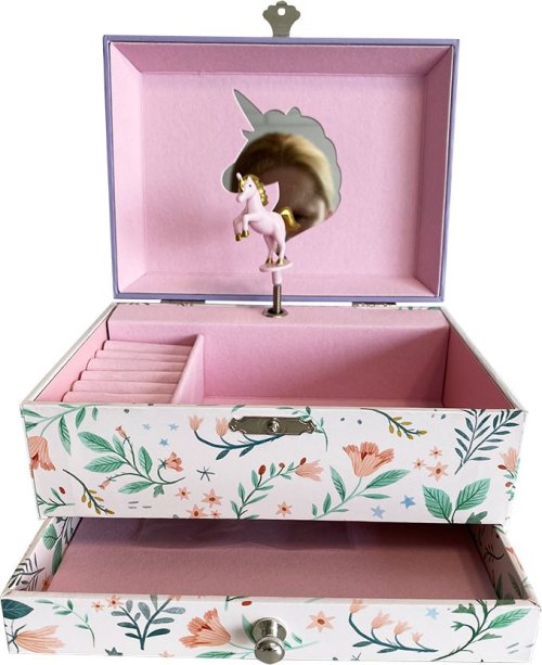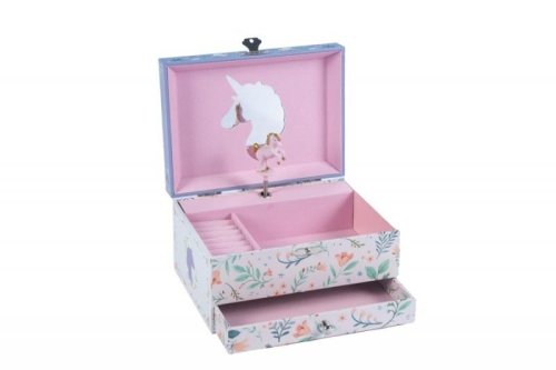 po otvorení skrinky začne hrať jemná melódia a malý jednorožec sa otáča pred svojim zrkadlom súčasťou je jedna zásuvka a malé priehradky na uloženie šperkov vyrobené z tvrdého odolného papiera