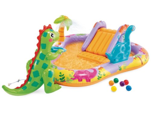 Skvelé hracie centrum v dizajne dinosaurov, s ktorým si v horúcich letných dňoch užiješ množstvo zábavy a osvieženia. Možnosť pripojenia záhradnej hadice pre parádny vodotrysk. Súčasťou centra je vodná šmykľavka a 6 loptičiek.