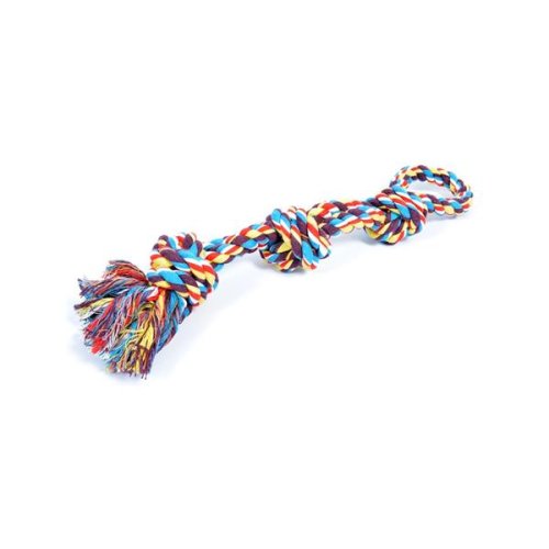 Bavlnené preťahovadlo pre psov je spletené z pevných farebných povrázkov s uzlami. Na jednej strane je zakončené okom pre lepší úchop pri hre. Hodí sa na preťahovanie, aportovanie aj hryzenie. Bavlnené povrázky počas hry prirodzene čistia chrup a prispievajú tak k zdraviu zubov a ďasien. Dĺžka (cca): 60 cm Materiál: bavlna Upozornenie: Nie je určené deťom. Hračku pravidelne kontrolujte av prípade poškodenia prestaňte používať.