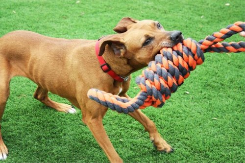 Bavlnené preťahovadlo s dvoma držadlami pre psy veľkých plemien. Typ hračky: textilná, bavlnená, hryzacia, aportovacia, preťahovacia Materiál: bavlna Rozmery (cca): 55 × 11 × 11 cm