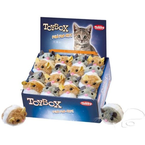 Balenie hračiek pre mačky, ktoré obsahuje plyšovú myšku, ktorá po natiahnutí vibruje. Balenie obsahuje 24 ks. Rozmery: 6,5 cm