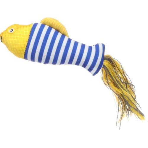 Hračka pre mačky v tvare ryby je vyrobená z mäkkého materiálu s jemne textúrovaným povrchom. Ryba je naplnená catnipom (šantou mačacou), ktorého vôňa väčšinu mačiek priťahuje a tým zvyšuje ich záujem o hračku. Pre ešte väčšie vzrušenie z hry má ryba na konci chvosta povrázky. Rozmery (cca): 11 × 2,5 × 5 cm Materiál: polyester Farba, vzor: žltá, modrá, biela, pruhovaná Upozornenie: Nie je určené deťom. Mačky môžu reagovať na vôňu šanty mačacie rozdielne. Na mačku pri hre dohliadajte a hračku jej nechávajte k dispozícii iba na obmedzenú dobu. Hračku pravidelne kontrolujte av prípade poškodenia prestaňte používať.