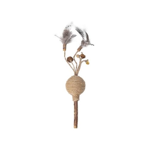 Hračka je vyrobená z dreva matatabi (japonského kivi), ktorého vôňa je pre mnoho mačiek príťažlivá, a sisalového povrázku, na ktorom sú pripevnené pierka a dve rolničky. Vďaka rôznorodým textúram a zvuku rolničiek hračka stimuluje lovecké inštinkty mačky a pomáha zaháňať stres a nudu. Pri hryzení zároveň prispieva k dentálnej starostlivosti. Je ideálny pre zvedavé a aktívne mačky. Dĺžka (cca): 15 cm Materiál: matatabi, sisal, perie Upozornenie: Hračka nie je určená deťom. Na matatabi môžu mačky reagovať rozdielne. Na použitie iba pod dohľadom. Hračku pravidelne kontrolujte av prípade poškodenia prestaňte používať.