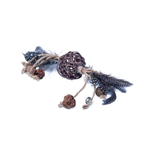 Hračku tvorí ratanový loptička, ku ktorému sú pripevnené pierka a jutové povrázky s rolničkami a guličkami z lisovaného catnipu (šanty mačacie) a matatabi (japonského kivi), ktorých vôňa je pre mnoho mačiek príťažlivá. Rôznorodé textúry a prírodné materiály stimulujú prirodzené lovecké inštinkty mačky a podnecujú ju k aktívnej hre. Rozmery (cca): 4,5 × 8 cm Materiál: ratan, matatabi, juta, perie Upozornenie: Hračka nie je určená deťom. Na matatabi a šantu mačacie môžu mačky reagovať rozdielne. Na použitie iba pod dohľadom. Hračku pravidelne kontrolujte av prípade poškodenia prestaňte používať.