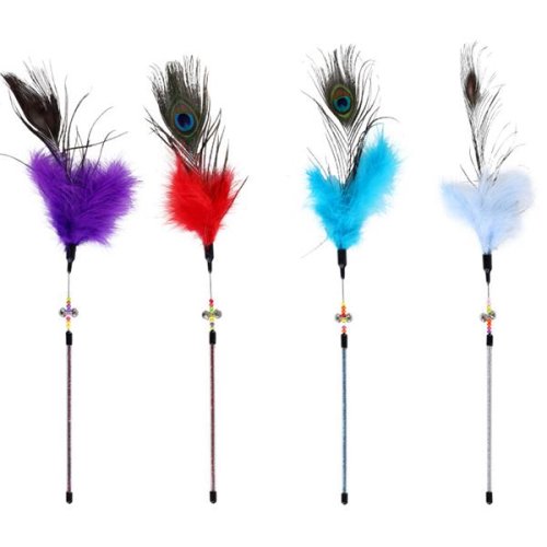 plastový prútik s trblietkami s cinkajúcimi rolničkami, korálkami a hustými pierkami zaháňa nudu, stimuluje poľovný inštinkt