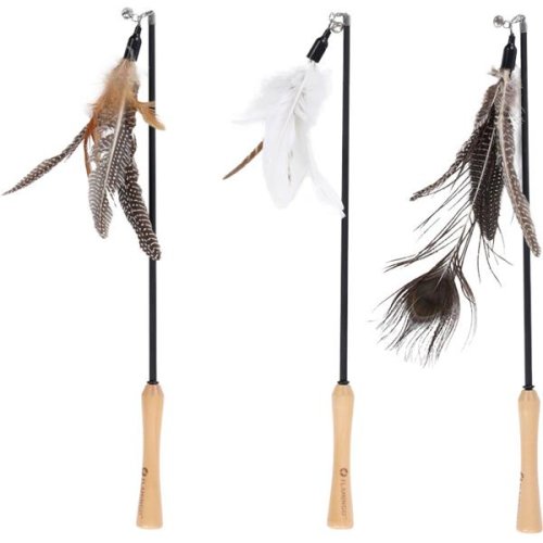 sklolaminátová palička s drevenou rukoväťou s cinkajúcou rolničkou, hustými pierkami a drievkom matatabi zaháňa nudu, stimuluje poľovný inštinkt vymeniteľný/rozšíriteľný záves nastaviteľná dĺžka paličky