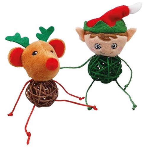 Vianočné hračky pre mačky majú podobu elfa alebo soba s plyšovou hlavou, telom z prútenej loptičky a nohami a rukami z povrázkov. Škriatok aj sob navyše obsahujú catnip (šantu mačaciu), ktorého vôňa povzbudzuje k hre až 70% mačiek. Box obsahuje 16 ks hračiek. Dĺžka (cca): 10 cm (bez nôh) Materiál: plyš, prútie, šanta mačacie Farba: hnedá, zelená Upozornenie: Hračka nie je určená deťom. Mačky môžu reagovať na vôňu šanty mačacie rozdielne. Na mačku pri hre dohliadajte a hračku jej nechávajte k dispozícii iba na obmedzenú dobu. Hračku pravidelne kontrolujte av prípade poškodenia prestaňte používať.