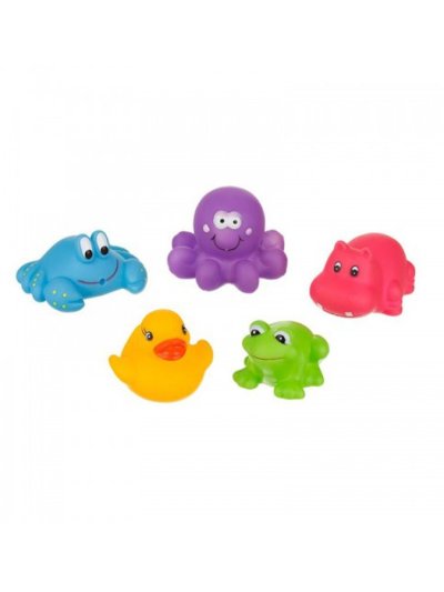 Farebné hračky do kúpeľa Akuku. Sada 5 roztomilých farebných hračiek - kačička, žabka, hrošík, krab, chobotnica. Ideálne na hranie vo vani. Veselé farby priťahujú pozornosť našich najmenších. Každá hračka má otvor, ktorým môžete striekať vodu. Zaoblené tvary zaručujú bezpečnosť počas hry. Vyrobené z bezpečných, vysoko kvalitných materiálov, neobsahujú bisfenol A. Výška hračiek 4 až 5 cm.
