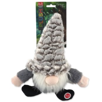 Plyšový škriatok v šedej farbe. Čiapka šuštia a pri stlačení nad hlavou hračka píska.