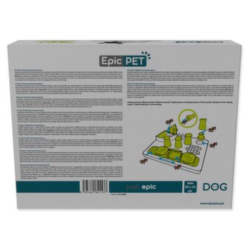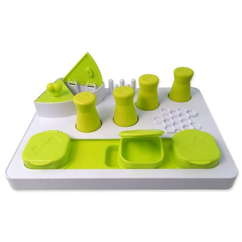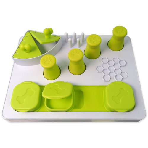 Schovajte granule alebo maškrtu do hračky a nechajte psa si užiť zábavu s hľadaním. Pes môže použiť labu alebo ňufák na posúvanie plastových štvorcov, ich otvorenie alebo nadvihnutie častí hračky a získať tak maškrtu.