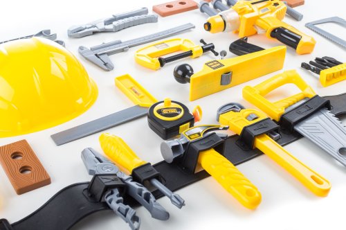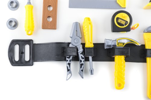 V sade nájdete vŕtačku s vrtákmi, kľúče, skrutky, matky, kladivo, skrutkovač, zverák, píly, podložky na vŕtanie, meter, uhlomer, posuvné meradlo, kliešte, ochrannú prilbu a mnoho ďalšieho. Skrátka všetko, čo je v dielni potrebné. Hra s náradím zlepšuje deťom motoriku , cvičí ich trpezlivosť a hlavne im prinesie veľa zábavy.