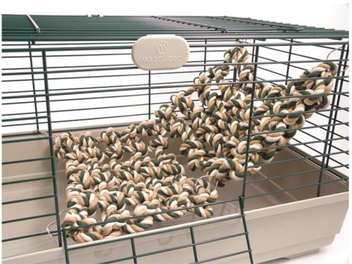 Splietané bavlnené laná sú skvelou hračkou na lezenie a šplhanie pre potkanov a fretky. Jednoduché upevnenie na klietku pomocou kovových úchytov. Možnosť zavesenia v rôznych polohách – od stropu k stene, medzi stenami, medzi klietkami, atď. Zavesením na výšku vytvoríte v klietke lezeckú stenu, zavesením na šírku bude sieť slúžiť ako most alebo hamak. Bavlnenú sieť je možné tiež zavesiť do klietky či voliéry, papagáje po nej budú určite radi šplhať. Pre ešte väčšiu fyzickú aktivitu a zábavu je možné sieť skombinovať s lanovým mostom Boredom Breaker Rope Bridge. Lanová sieť je k dispozícii v zeleno/bielo/béžovej, fialovej a fialovo/sivej farbe. Rozmery: 33 x 23 cm